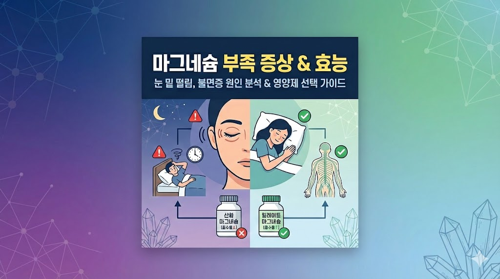 눈 밑이 떨리고 잠이 오지 않는다면, 이는 당신의 몸이 "제발 쉬게 해달라"고 보내는 화학적 신호입니다. 오늘부터 나의 증상과 예산에 맞는 마그네슘 영양제를 선택하여, 무너진 신경계의 균형을 되찾으시길 바랍니다. 작은 미네랄 하나가 삶의 질을 바꿀 수 있습니다.