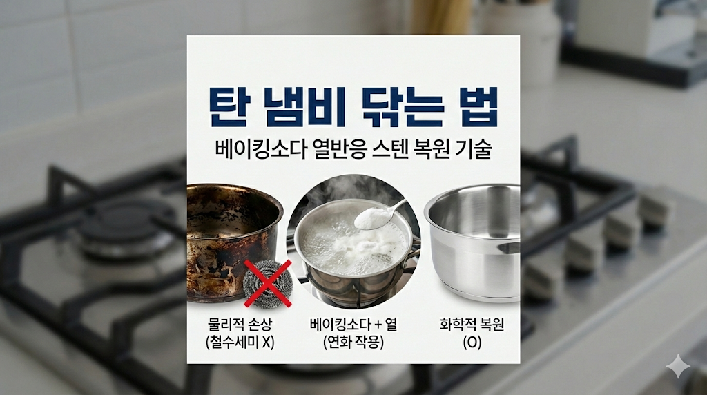 요리를 하다가 잠깐의 방심으로 냄비를 까맣게 태워 먹은 경험은 누구에게나 있습니다. 바닥에 눌어붙은 새카만 탄화물은 주방 세제로 아무리 닦아도 지워지지 않으며, 급한 마음에 철 수세미로 박박 문지르게 됩니다. 하지만 이러한 물리적 마찰은 스테인리스 냄비의 보호막인 '부동태 피막(Passive Film)'을 훼손하여 부식을 초래하고, 코팅 냄비의 경우 수명을 즉시 종료시키는 치명적인 실수입니다. 본 칼럼에서는 탄 냄비 닦는 법의 핵심인 '화학적 연화 작용'을 분석하고, 베이킹소다와 열에너지를 결합하여 탄 자국을 손상 없이 박리시키는 과학적인 복원 메커니즘을 소개합니다.